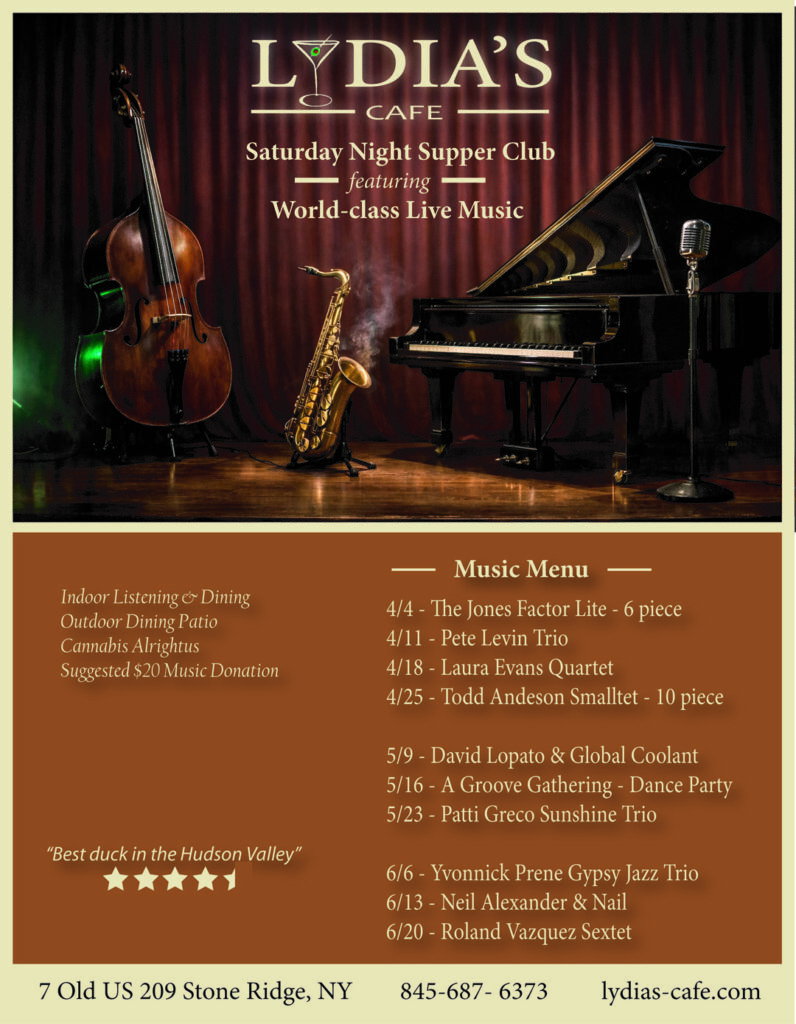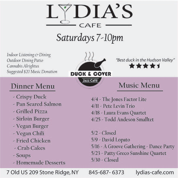 Since 2005, Lydia’s Cafe has earned the reputation for bringing top-tier jazz musicians in from around our area and NYC every Saturday night, presented in an intimate, friendly environment.
